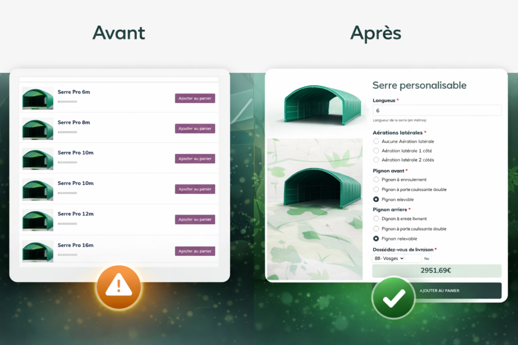 Les Serres Gauloises devaient digitaliser une offre de serres semi-sur-mesure, ultra variable (dimensions, options, contraintes logistiques, livraison selon département). Le marché restait peu lisible : parcours confus, prix et coûts de transport tardifs, frein à l’achat. Hexalumi a donc conçu un configurateur WordPress calculant prix et livraison en temps réel pour convertir directement.