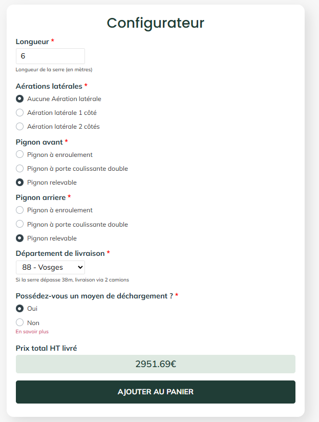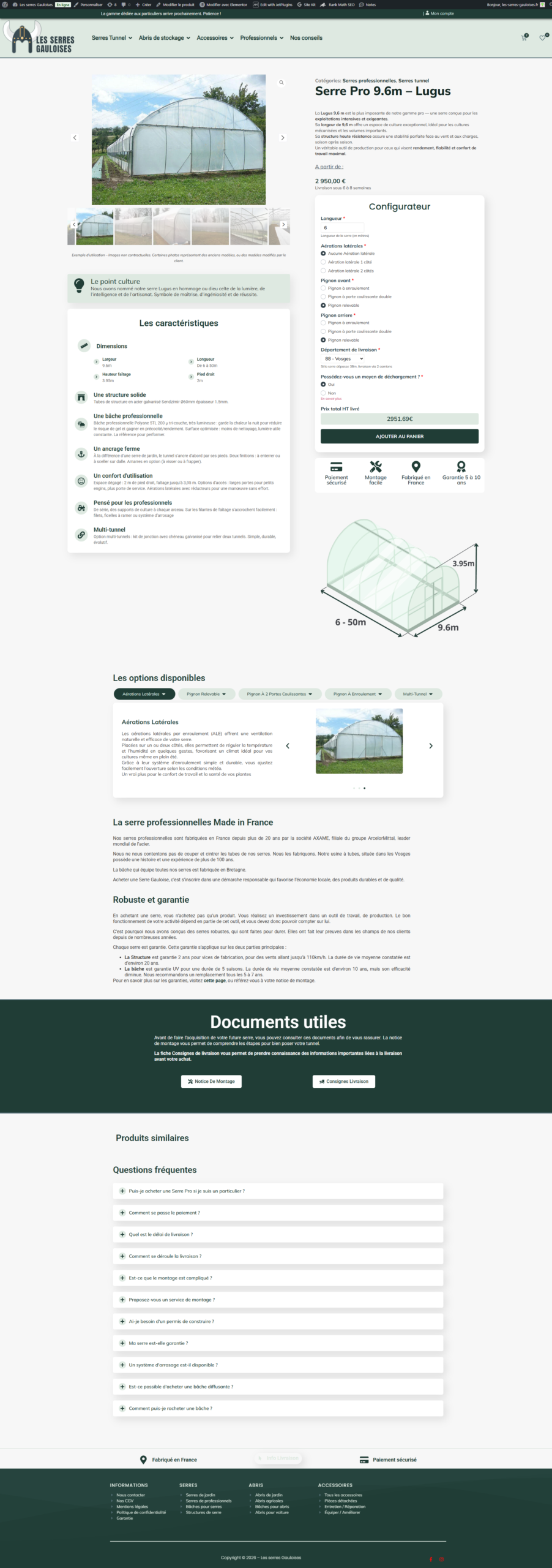 Les Serres Gauloises devaient digitaliser une offre de serres semi-sur-mesure, ultra variable (dimensions, options, contraintes logistiques, livraison selon département). Le marché restait peu lisible : parcours confus, prix et coûts de transport tardifs, frein à l’achat. Hexalumi a donc conçu un configurateur WordPress calculant prix et livraison en temps réel pour convertir directement.